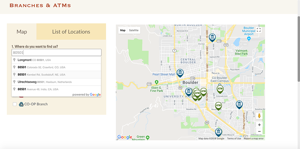 I developed the interaction and visual design based on established UI patterns. This required a custom content type in our CMS for ECU branches and ATMs that allowed me to control the pop up content when a map pin is clicked. The location search field was connected to the Google Maps API to allow for pre-population of the results list as the user started typing. This also allowed me to pinpoint locations with precise latitude and longitude values for each branch and atm. The map has a connection to the COOP network API so we could display shared branches and ATMs.