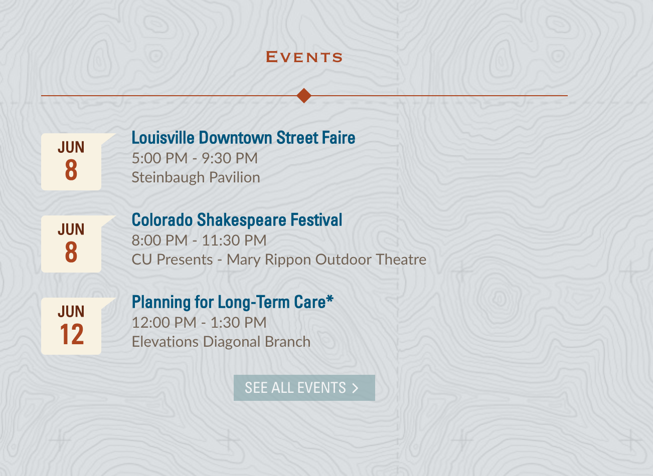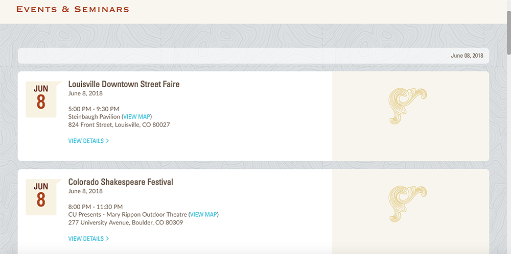 Elevations events & seminars are very popular among members and at any given time, there were several upcoming event listings. The original event content type in the CMS was cumbersome to use and not very efficient, so I led a project to start utilizing Eventbrite which we quickly realized was much more flexible and streamlined our processes.