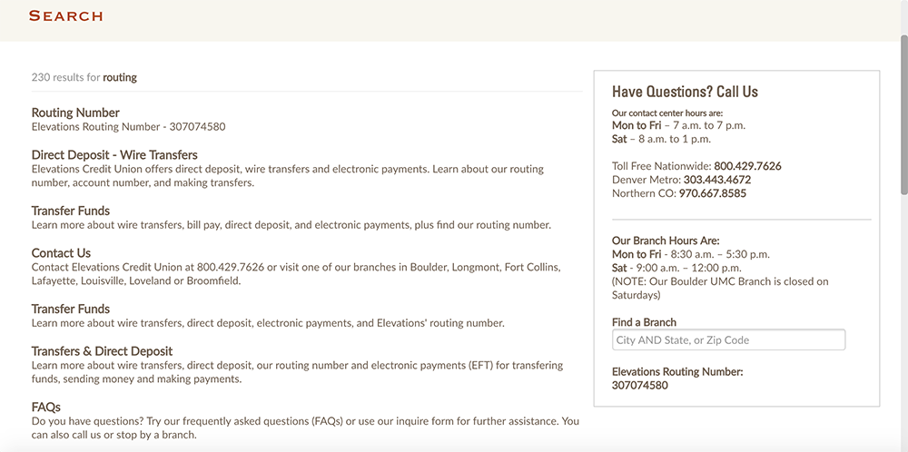 Monitoring and optimizing internal and organic search results was a ongoing responsibility and I routinely analyzed data to refine the weighting of the top search terms. I created 'best bets' in the CMS, which in this example, allowed me to make sure that the actual routing number was part of the result and first in the list when searched for. The SERP initially did not have right rail content and I decided to embed our contact info along with the branch locator search bar so users could get in touch if their search was unsuccessful.